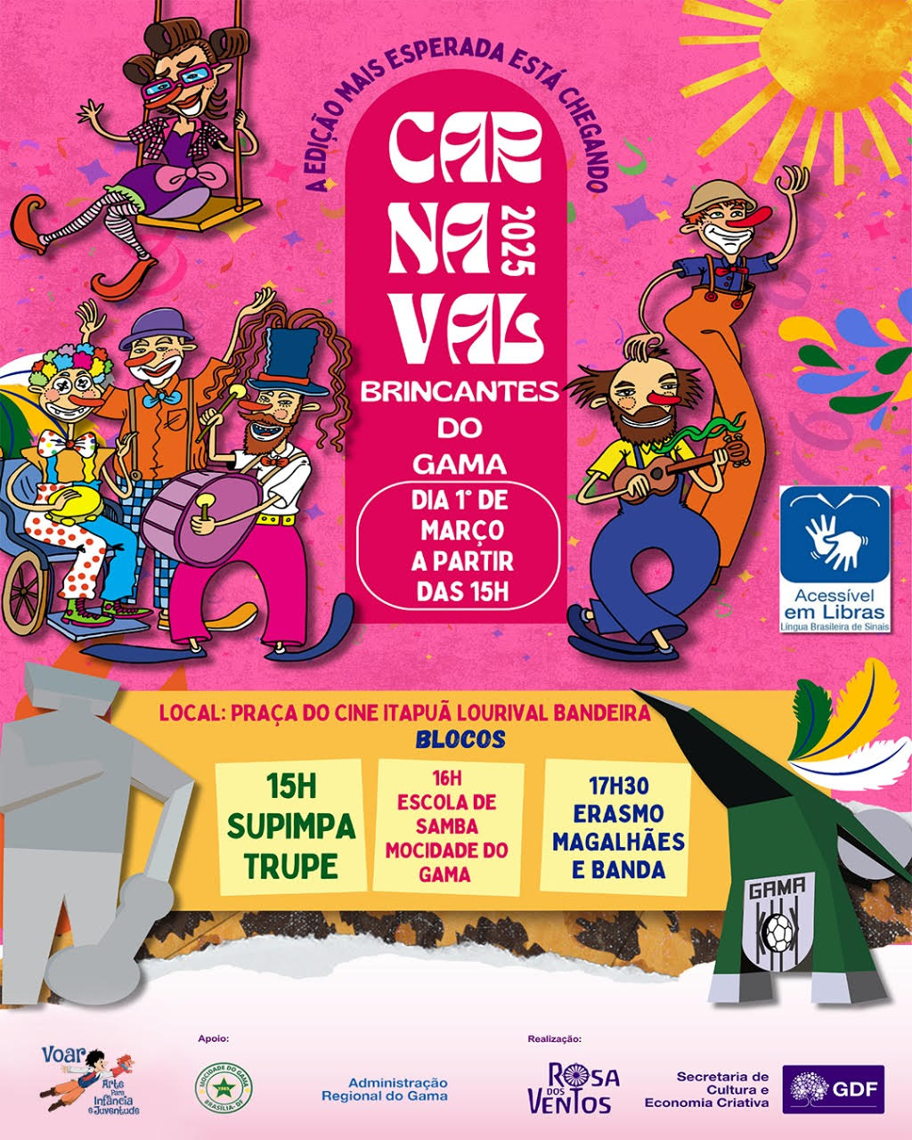 Neste sábado (1° de março), na Praça do Cine Itapuã Lourival Bandeira, o tradicional Bloco Brincantes do Gama receberá os foliões da cidade a partir das 15h, com o show da Supimpa Trupe. Já às 16h, será a vez do som contagiante de integrantes da Escola de Samba Mocidade do Gama. Erasmo Magalhães e Banda encerrarão a folia às 17h30. Tudo aberto, gratuito, com libras e audiodescrição. A iniciativa também conta com o apoio da Administração Regional do Gama e da Escola Mocidade do Gama. Informações pelo Instagram @voarteatrodeboneco