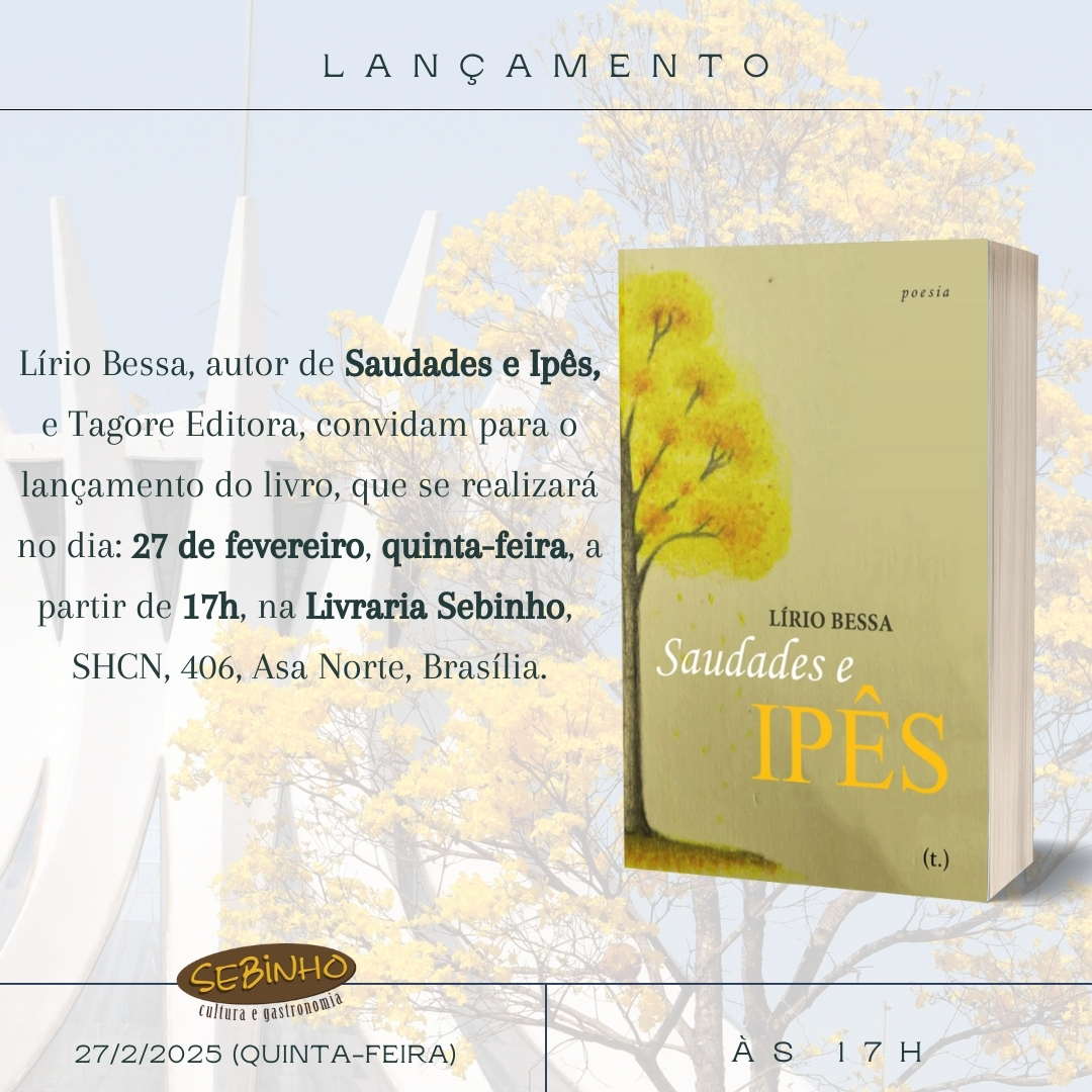 Um poeta nasce hoje no Sebinho (406 norte), às 17h, com o lançamento do livro Saudades e Ipês. Como editor, gosto de dizer que o lançamento de um livro é um rito de passagem para todo escritor. É um momento especial, uma oportunidade única para divulgar seu trabalho, compartilhar sua arte com amigos e alcançar leitores que se encantam com o gênero literário.