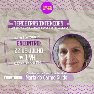 Enquanto isso, nesta terça-feira, 22, acontece a edição de julho do Programa Terceiras Intenções, com Maria do Carmo Guido, coordenadora do Fórum da Mulher Idosa. Ela vai conversar sobre envelhecimento feminino e a 1a. Conferência da Mulher Idosa. No canal do You Tube Coletivo Filhas da Mãe, ao vivo, das 19 às 20h. Link Aqui.