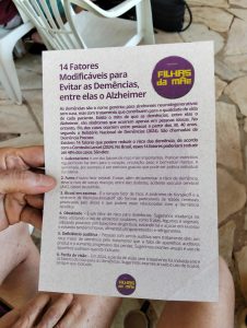 Brasília – Este domingo o Coletivo Filhas da Mãe abriu, na Capital Federal, a campanha Setembro Roxo, mês de conscientização sobre as demências, entre elas o Alzheimer. A abertura ocorreu no Parque Olhos D’Água, com distribuição de folhetos informativos à população e fala sobre prevenção de demências durante a apresentação musical do Coletivo Café com Chorinho.