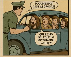 Baculejos terminados, salvos pelo chão solar, somos liberados. O Mané ainda pede, espera um pouco que vou procurar a erva. Larguei ele lá agachado procurando sua preciosa caixinha.