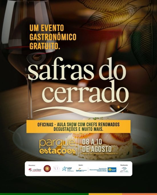 Nos dias 8, 9 e 10 de agosto, no estacionamento 11 do Parque da Cidade, vai acontecer o segundo evento Safras do Cerrado, onde a arte, a cultura e a gastronomia se encontrarão em uma Vila Gastronômica com mais de 80 expositores locais. Serão muitos sabores com a degustação de vinhos, cachaças, cafés e cervejas artesanais.
