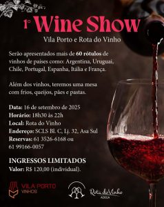 O sommelier Marcos Rachelle, Marquinhos,em parceria com a Vila Porto irá realizar mais um evento na sua loja, a Rota do Vinho, na SCLS 410, o 1o. Wine Show. Serão degustados mais de 60 rótulos de 7 países.