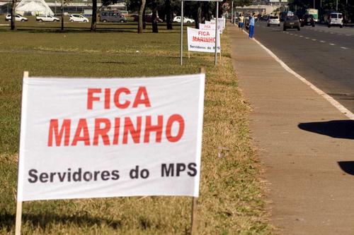 A Esplanada amanheceu coberta de faixas. Todas exibiam o mesmo recado: “Fica Marinho”. O ministro viu, leu e não gostou. Contrariado, convocou a equipe: