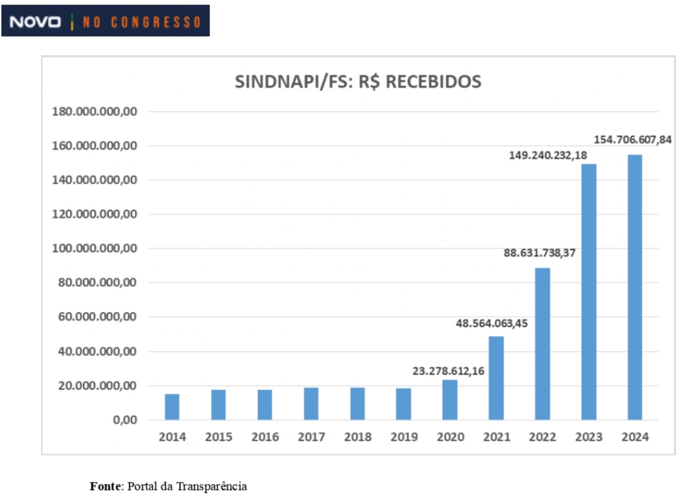 Por Eduarda Esposito — O partido Novo pediu ao Tribunal de Contas da União (TCU) que investigue do Sindicato Nacional dos Aposentados, Pensionistas e Idosos (Sindnapi), instituição em que o vice-presidente, Frei Chico, é irmão do presidente Luiz Inácio Lula da Silva. Na representação enviada ao TCU, o Partido Novo afirma que o Sindnapi recebia, por ano, em torno de R$ 20 milhões, entretanto, houve um aumento de mais de 564% entre 2020 e 2024 — passando de R$ 23 milhões para R$ 155 milhões por ano. Os dados foram obtidos através do Portal da Transparência. Veja o gráfico a seguir:
