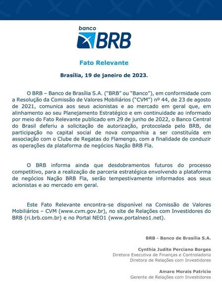 O texto acrescenta que “desdobramentos futuros do processo competitivo para a realização de parceria estratégica envolvendo a plataforma de negócios Nação BRB Fla serão tempestivamente informados aos seus acionistas e ao mercado em geral”.