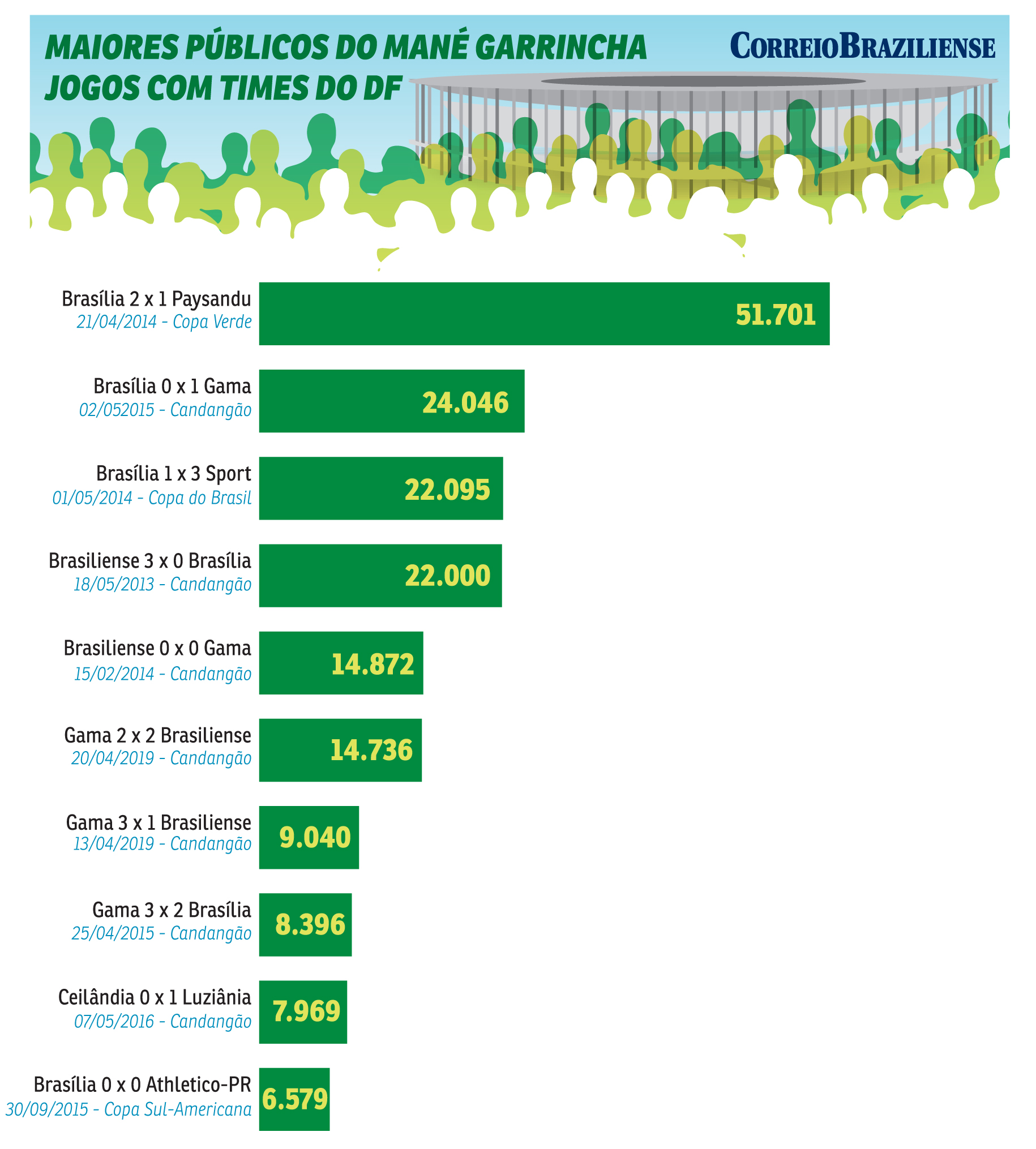 O clássico verde-amarelo entre Gama e Brasiliense ocupa apenas o quinto lugar no ranking. O melhor público do dérbi, no Mané Garrincha, teve 14.872 pagantes. O outro duelo disputado na principal casa do futebol candango teve menos plateia: 14.736 na final do Candangão de 2019.