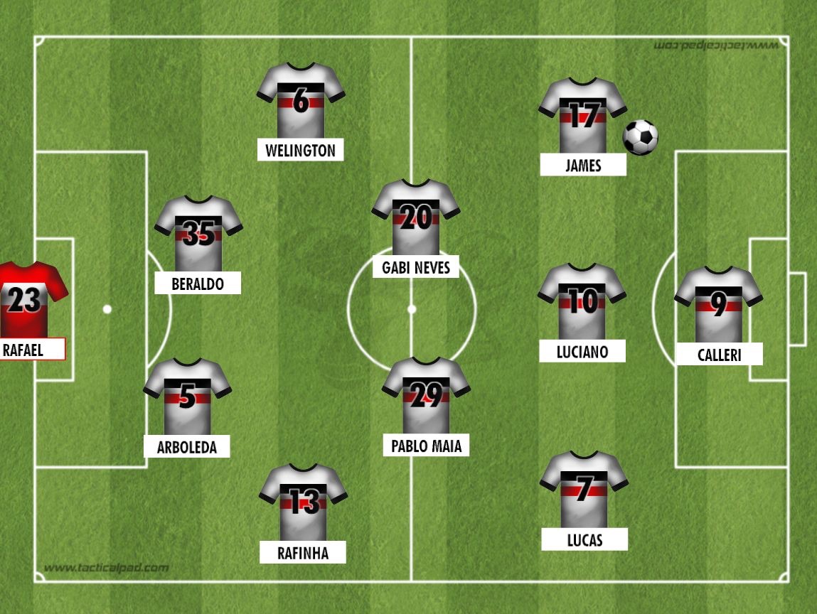 Com a chegada de Lucas Moura, uma outra opção seria o 4-2-3-1, com Lucas aberto na direita, James centralizado e um ponta ou meia aberto na outra banda para dar suporte a Luciano ou Calleri na ataque. Uma opção seria o atacante Marcos Paulo. A outra, Luciano centralizado atrás de Calleri.