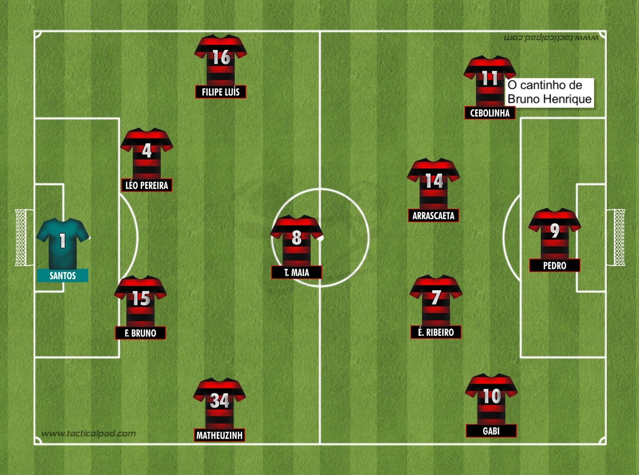O Flamengo terminou a partida jogando assim: Santos; Matheuzinho, Fabrício Bruno, Léo Pereira e Filipe Luís; Thiago Maia; Gabriel Barbosa, Éverton Ribeiro, Arrascaeta e Everton Cebolinha; Pedro. Você pode considerar o modelo 4-1-3-2 também se preferir. O fato é que, à exceção de Gerson, que havia deixado o time durante a partida, Vítor Pereira tentou encaixar os mais talentosos entre os 11 no fim do “jogo-treino” com casa cheia diante do Nova Iguaçu.