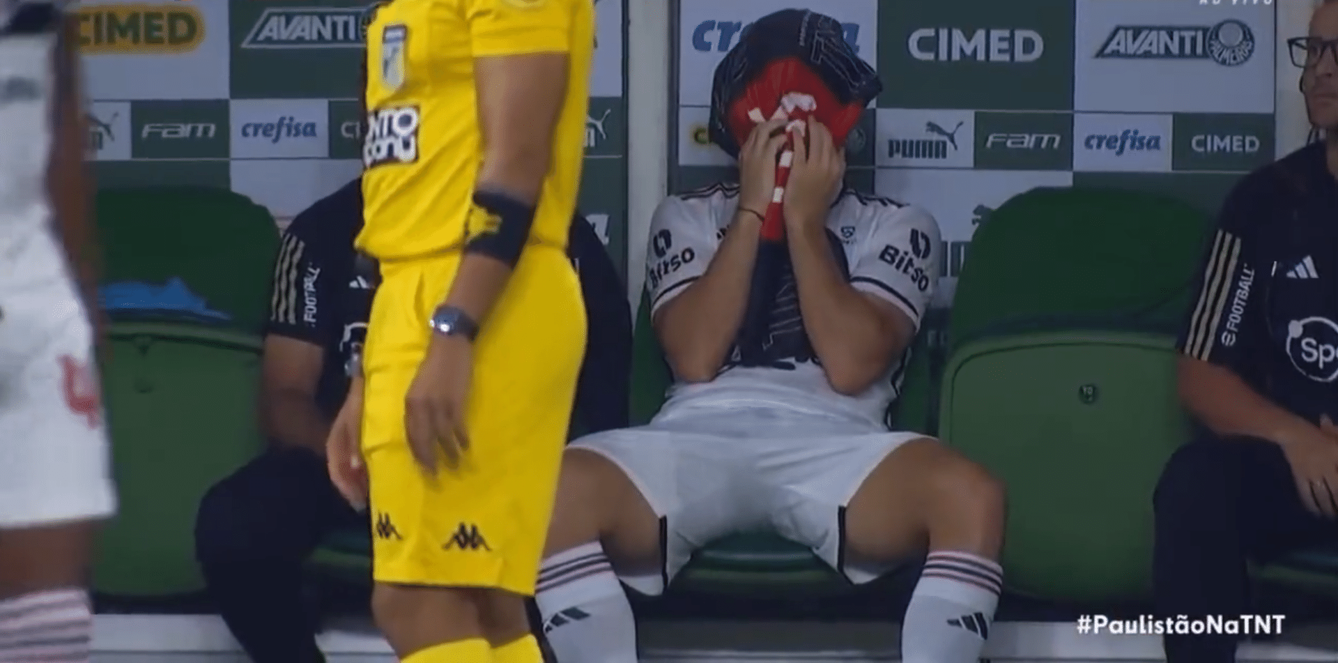 Galoppo chora no banco: drama do melhor jogador tricolor no ano. Foto: Reprodução/TNT Sports