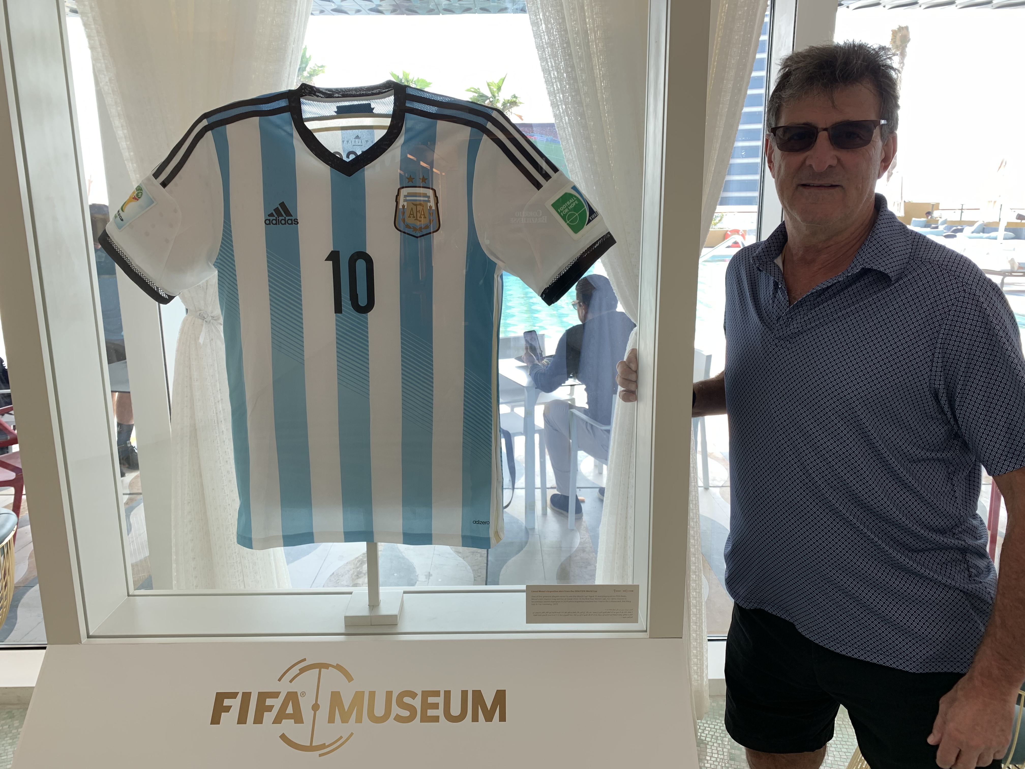 Mario Kempes e a camisa de Messi no hotel de Lusail em que está hospedado. Foto: Marcos Paulo Lima/Blog Drible de Corpo