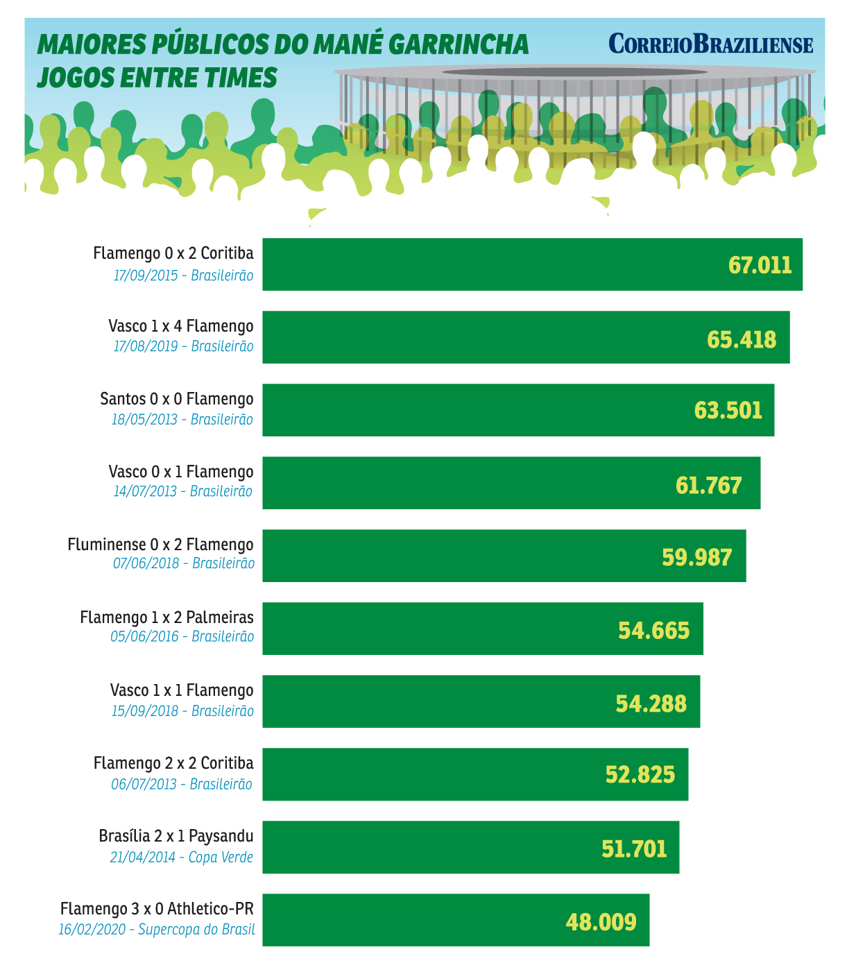 O Mané Garrincha tem capacidade para 72.788 espectadores. Perde apenas para o Maracanã (78.838). Das 10 maiores plateias entre clubes, nove têm o Flamengo como mandante ou visitante. O recorde é 67.011 pagantes na derrota rubro-negra para o Coritiba por 2 x 0 pelo Campeonato Brasileiro de 2015. Comandado pelo técnico Oswaldo de Oliveira à época, o time carioca buscava a sétima vitória consecutiva. Perdeu e saiu do G-4.