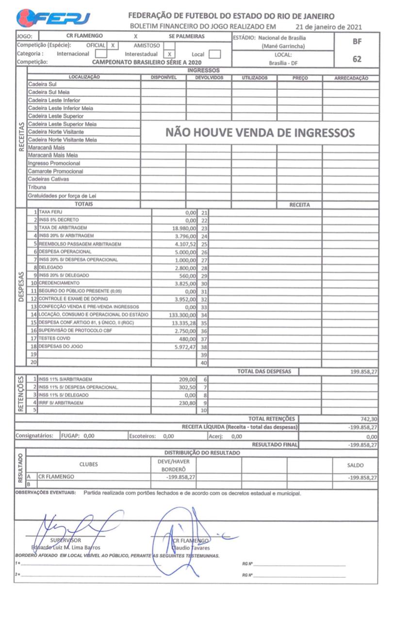 O prejuízo registrado no duelo com o Palmeiras, em Brasília, poderia ter sido maior. Como não houve venda de ingressos, as federações de futebol do Distrito Federal e do Rio de Janeiro não tiveram direito ao percentual de 5% e 10%, respectivamente, sobre a arrecadação bruta da partida. Mesmo assim, a ausência da plateia causa danos econômicos à receita do clube.