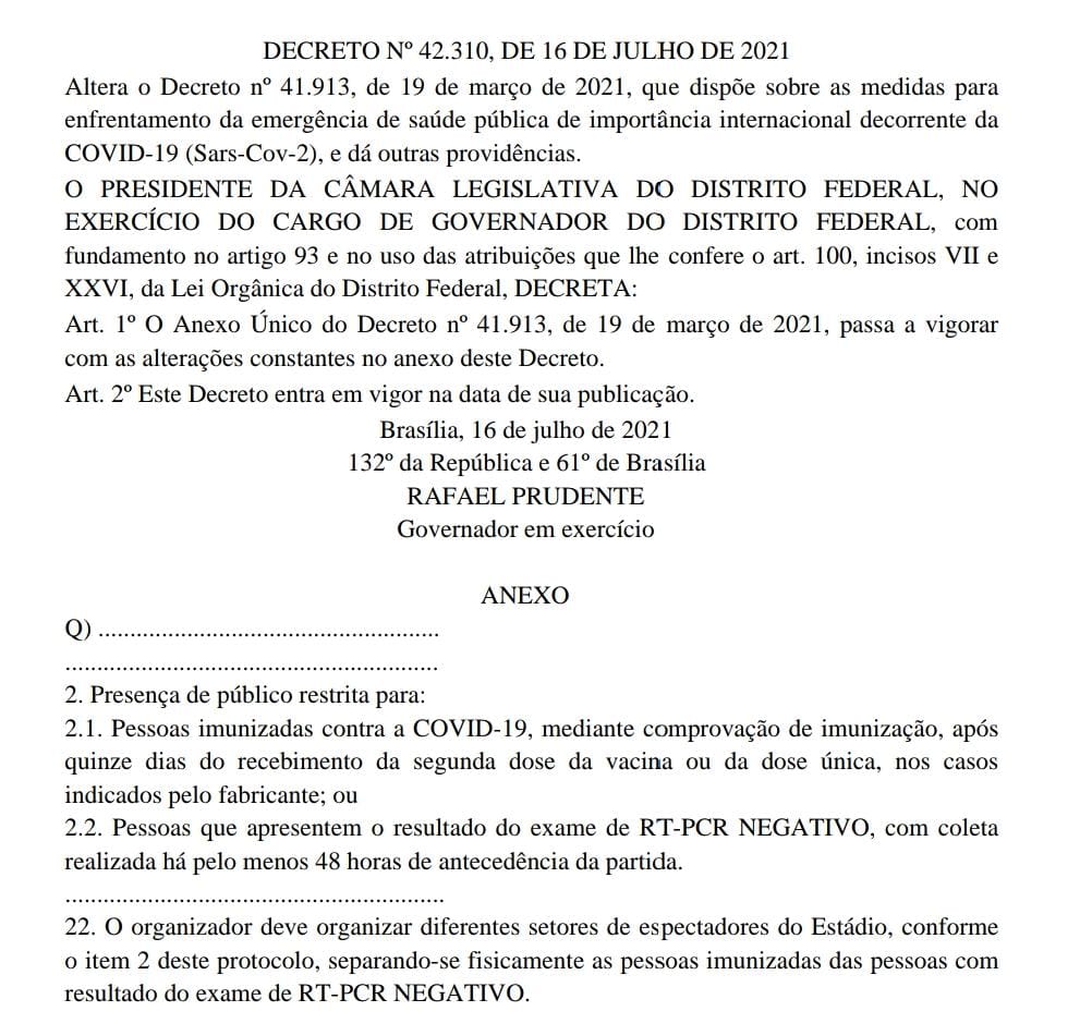 O primeiro decreto do GDF dizia que o torcedor poderia ter acesso ao estádio apresentando comprovante das doses da vacina “e” teste negativo. Corrigido, o novo texto usa a palavra “ou”. Resumindo: acesso a pessoas imunizadas “ou” as que apresentarem PCR negativo.