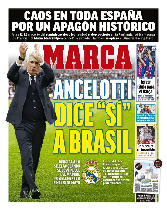 O diário Marca traz na manchete: Ancelotti dice “si” a Brasil (Ancelotti diz sim ao Brasil).