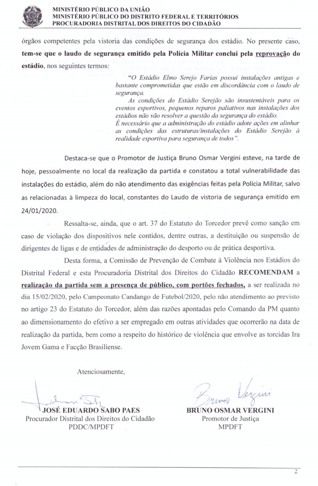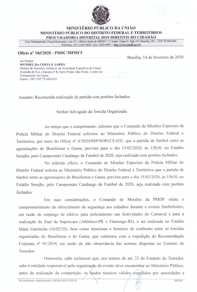 O Ministério Público do Distrito Federal determinou na tarde desta sexta-feira que o clássico entre Brasiliense x Gama neste sábado, às 15h30, no Serejão, em Taguatinga, pela quinta rodada do Candangão, será com portões fechados. A nota aponta pelo menos dois motívos: a realização da Supercopa do Brasil na manhã de domingo, às 11h, entre Flamengo e Athletico-PR no Mané Garrincha; e o histórico de confrontos entre as uniformizadas dos dois principais clubes da capital do país. Até a manhã desta sexta, a recomendação era para que o jogo tivesse torcida única — apenas do Brasiliense, mandante do jogo. No post anterior publicado nesta sexta-feira, o blog mostrou que o DF garantiu a segurança de 11 clássicos do Rio de Janeiro realizados no Mané, mas assume a incapacidade de proteger os torcedores em um clássico local que raramente leva 10 mil pessoas aos estádios.