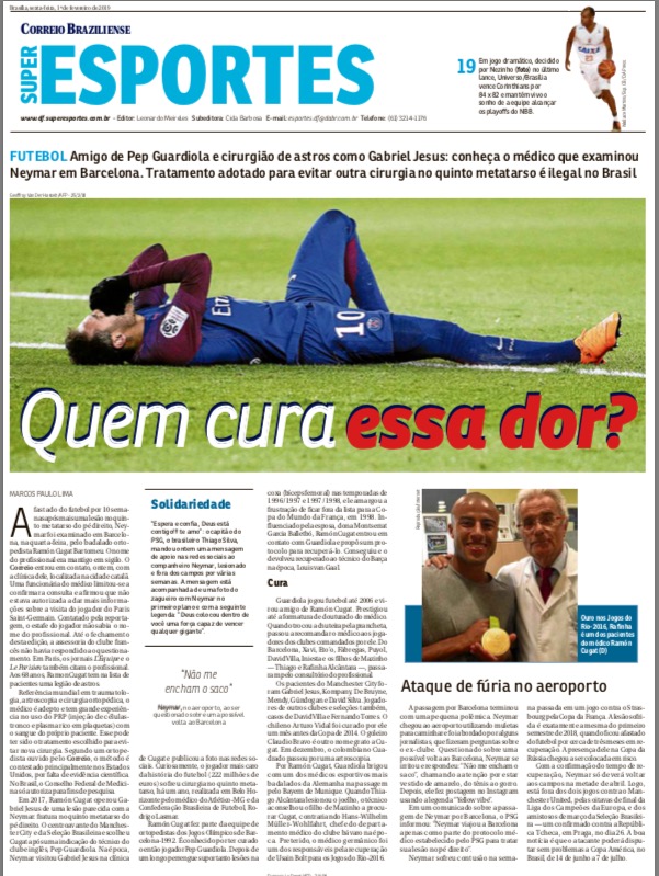Afastado do futebol por 10 semanas após mais uma lesão no quinto metatarso do pé direito, Neymar foi examinado em Barcelona, na quarta-feira, pelo badalado ortopedista Ramón Cugat Bartomeu. O nome do profissional não havia sido divulgado. O blog entrou em contato com a clínica dele localizada na cidade catalã. Uma funcionária do médico limitou-se a confirmar a consulta e afirmou que não estava autorizada a dar mais informações sobre a visita do jogador do Paris Saint-Germain. Contatado pela reportagem, o estafe do jogador não soube informar o nome do profissional. Em resposta ao questionamento, a assessoria do clube francês disse nesta sexta que a viagem a Barcelona faz parte do protocolo estabelecido na última terça-feira por renomados especialistas após exames realizados no Ooredoo Training Centre, o Camp des Loges — CT do PSG. Em Paris, os sites do L’Équipe e Le Parisien também citam Ramón Cugat. Aos 68 anos, ele tem na lista de pacientes uma legião de astros.
