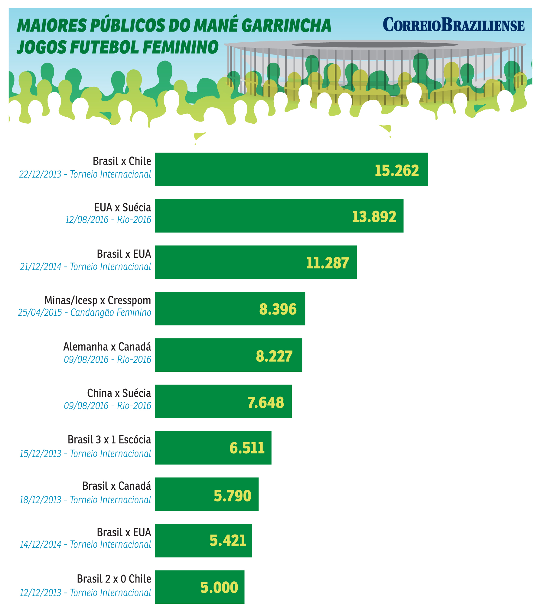 A Seleção domina a lista com seis jogos. O maior público é 15.262 pagantes no Torneio Internacional de Futebol Feminino de 2013. O Brasil goleou o Chile por 5 x 0 e conquistou o título da competição. O recorde poderia ser maior se Marta e companhia tivessem passado pela capital nos Jogos Olímpicos do Rio-2016. No entanto, as meninas não passaram pela capital do torneio. A equipe passou por Rio, Manaus, Belo Horizonte e São Paulo.