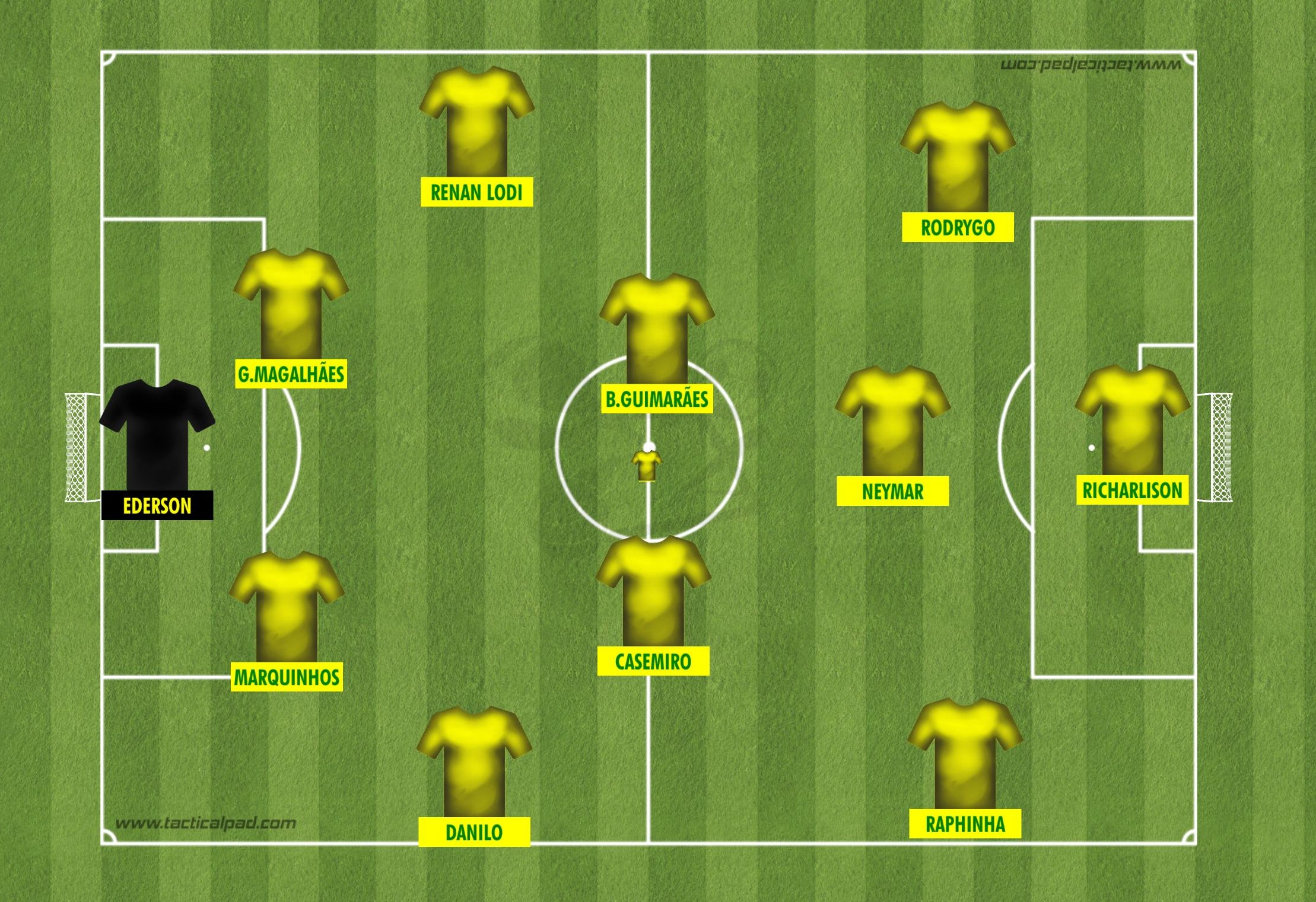 No meio de campo, Bruno Guimarães é muito versátil. Faz o papel de primeiro ou segundo volante de acondo com a necessidade do treinador. Na frente, Raphinha, Neymar, Rodrygo e Richarlison são atacantes de extrema mobilidade. O quarteto não guarda posição. Rodrygo é o camaleão da turma. Sabe jogar aberto nas duas pontas, recuado no papel de organizador e no ataque na função de falso 9.