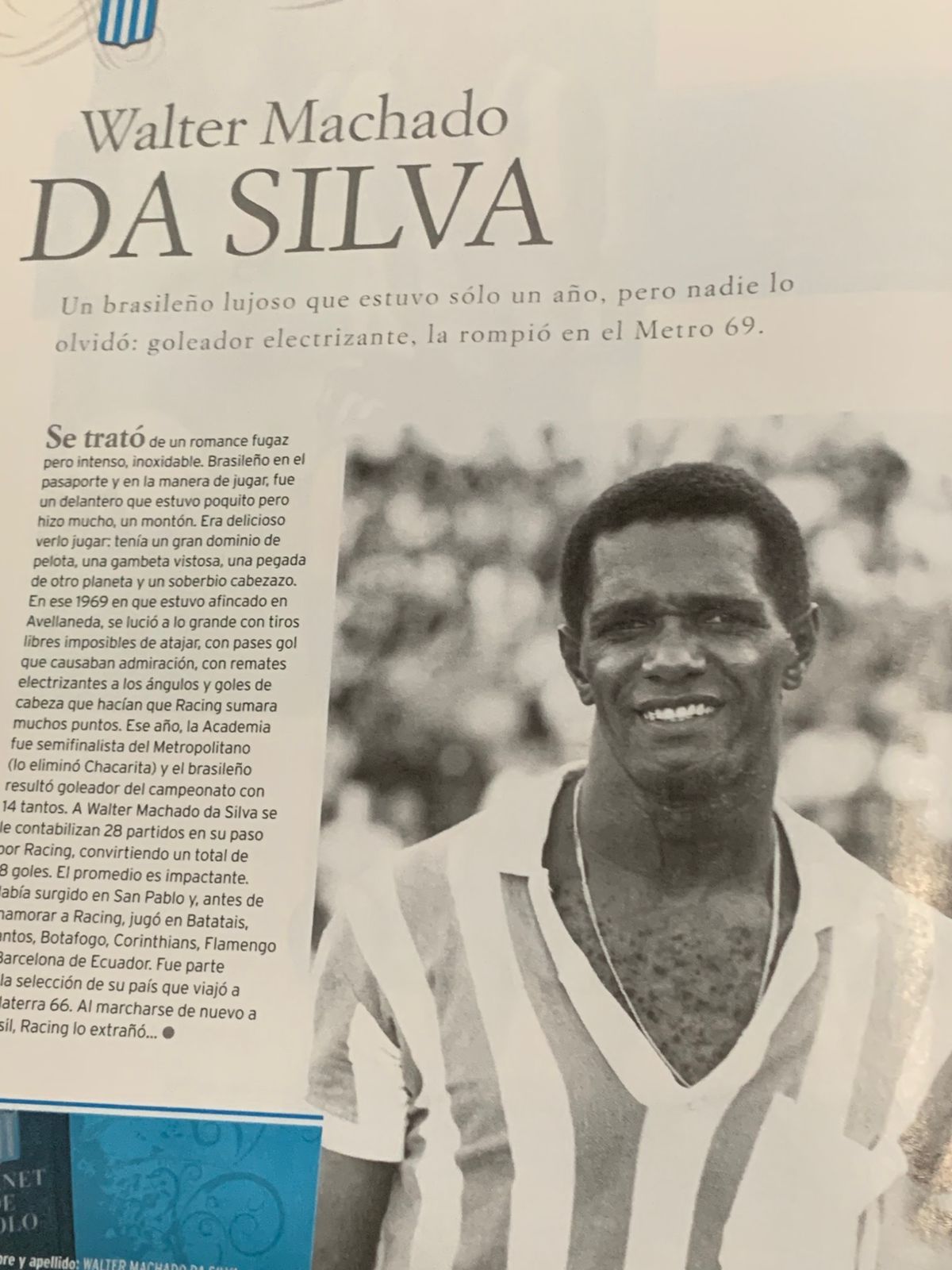 Página 14 de uma edição especial da revista El Gráfico: 100 ídolos do Racing. No índice, um nome chama a atenção: Walter Machado da Silva. “Um brasileiro de luxo que esteve somente um ano, mas ninguém o esquece: goleador eletrizante, sensação do Metropolitano em 1969”, descreve a publicação referindo-se a um jogador amado tanto pelo Racing como pelo Flamengo, adversários nesta terça-feira nas semifinais da Libertadores.
