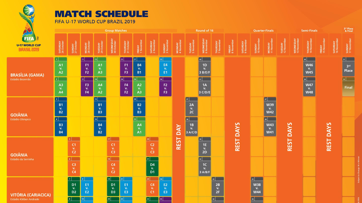 Como antecipou o blog em 15 de abril, a Fifa oficializará nesta quarta-feira a divulgação da tabela do Mundial Sub-17 com Brasília, Goiânia e Vitória sedes do torneio de 26 de outubro a 17 de novembro. Casa do Gama, o Bezerrão é o estádio que mais receberá jogos. São 18, entre eles a abertura, semifinais, decisão do terceiro e quarto lugar e a final. Os estádio Olímpicos e Serrinha, ambos em Goiânia, ficaram respectivamente com 10 e 8 jogos e o Kléber Andrade, no Espírito Santos, com 16. A definição das cidades foi tomada na visita dos mandatários da CBF, Rogério Caboclo, e da Fifa, Gianni Infantino, ao presidente da República, Jair Bolsonaro. O sorteio das chaves está marcado para amanhã, em Zurique, na Suíça (confira os 24 candidatos ao título no fim deste post).