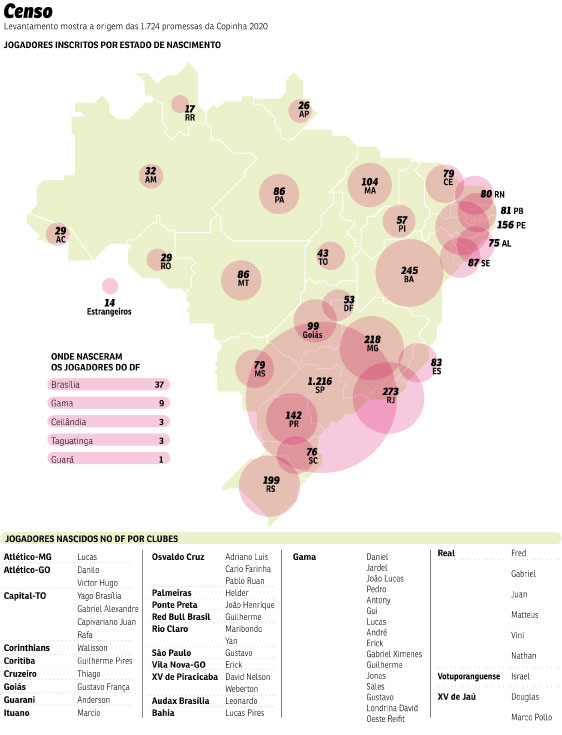 Enquanto isso, os candidatos a Reinier encaram a vida como ela é em grandes e minúsculos clubes do Brasil. O blog teve acesso ao Censo da Federação Paulista de Futebol (FPF). O documento aponta um estudo aprofundado sobre os 3.724 jogadores inscritos na Copa São Paulo 2020. Do total, 53 nasceram no Distrito Federal.