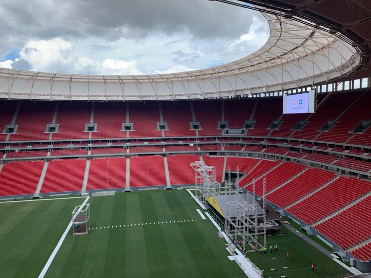Na semana passada, o Mané Garrincha recebeu o evento evangélico The Send Brasil. Foram montados palco e um tablado no campo de jogo. Como antecipou o blog no último sábado, havia preocupação com o estado do campo de jogo para a final da Supercopa do Brasil entre Flamengo e Athletico-PR na matinê deste domingo, às 11h, principalmente com as marcas deixadas pelas sapatas no piso da arena.