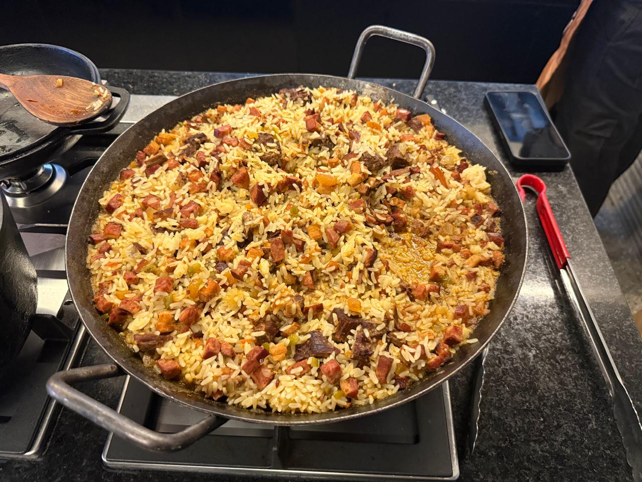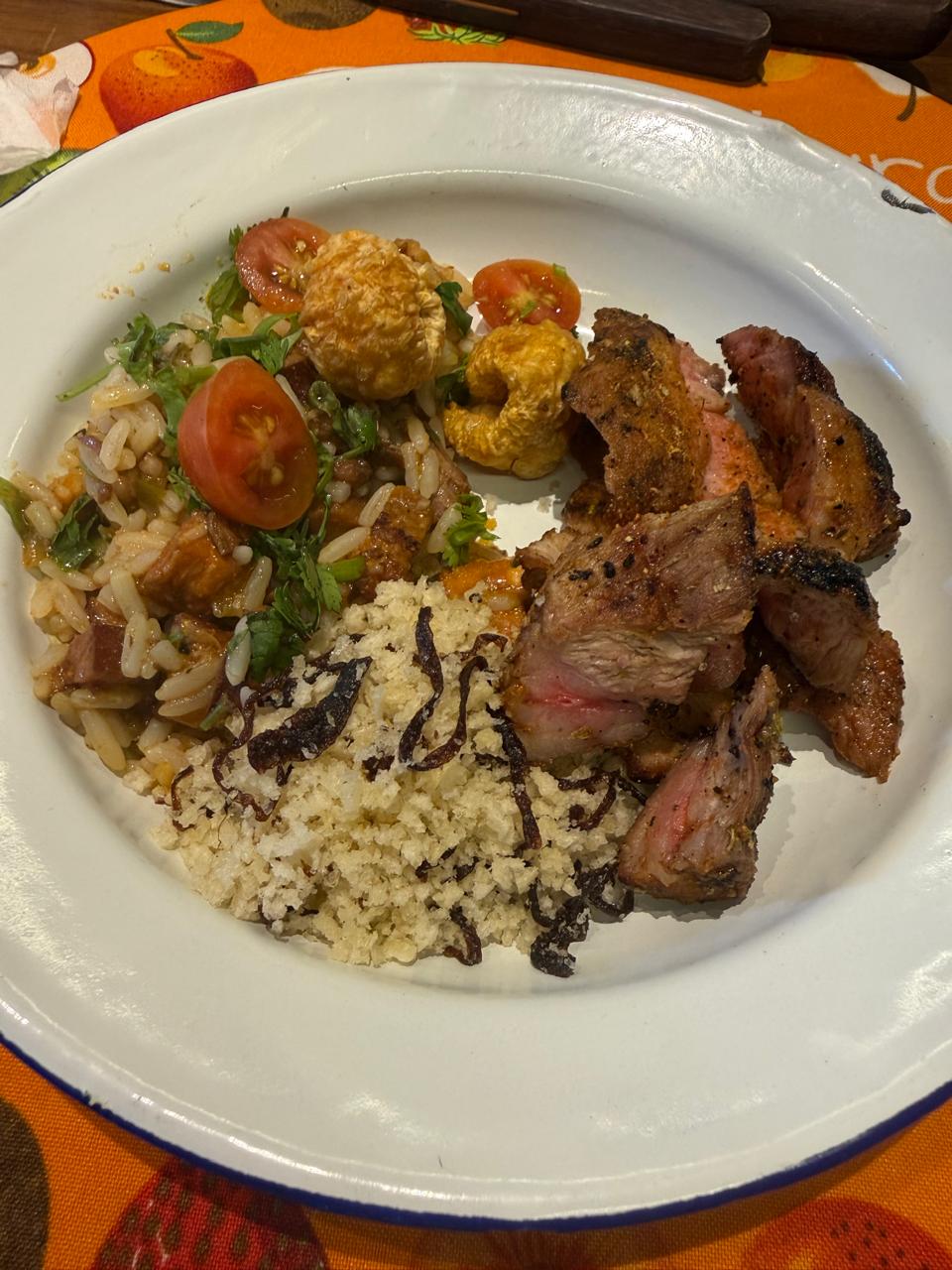 Entre os pratos principais há matambre suíno, servido como petisco, entraña (suculento corte que se tornou popular na Argentina é tirado da fraldinha do diafragma bovino), picanha steak, ancho maturado steak, ancho suíno Duroc e mix de legumes orgânicos. Como acompanhamentos, há arroz carreteiro, farofa de cebola crocante e feijão tropeiro além de sobremesas de banana assada com doce de leite e castanha de caju e queijo coalho com goiabada.