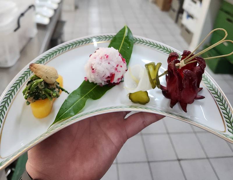 Afastada do Clube Nipo, da Avenida das Nações, onde funcionou por 13 anos o restaurante Yuzu-An, que fechou as portas dois anos e meio atrás devido à pandemia, a chef nissei foi chamada de última hora pela chancelaria brasileira para elaborar sabores típicos da culinária japonesa a fim de agradar a princesa. “Eu pensei em algo simples, que lembrasse a comida dos imigrantes, como arroz branco (oniguiri) com hibisco em conserva, cujo sabor ácido e um pouco salgado é o que mais se aproxima do umeboshi, a tradicional ameixa salgada que está na base da dieta japonesa”, explicou a chef.