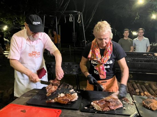 Enquanto isso, Francisco acompanhava o ponto de cozimento das três leitoas preparadas por ele, sob os cuidados e supervisão do biólogo Marco Antônio Veronese, “meu escudeiro”, como a ele se refere Francisco. Os dois são amigos de longa data e sempre cozinham juntos nos eventos realizados até no exterior. Na década de 1990, Ansiliero e Veronese assumiram o restaurante brasileiro que funcionou no Salon del Gusto, do evento Terra Madre, durante convenção anual do Slow Food, realizada em Turim, nas instalações antigas da fábrica Fiat.