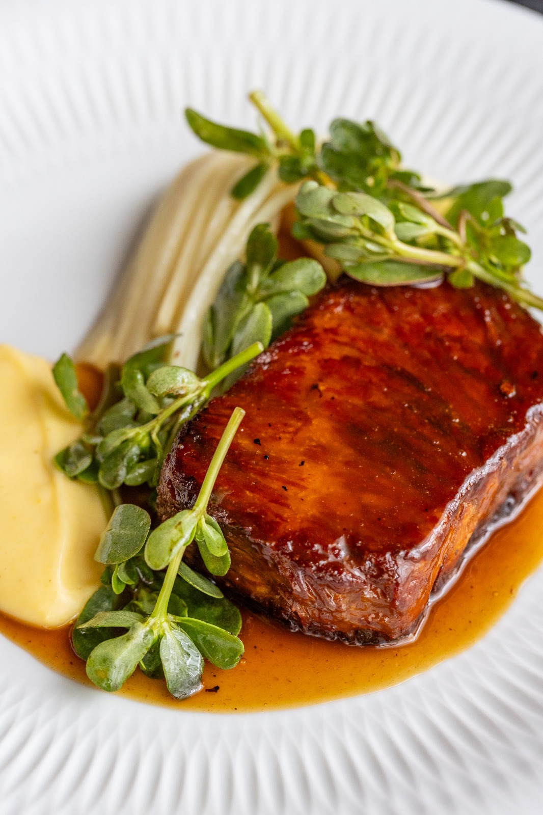 Entre os principais, destaque para o cupim preparado com salmoura rica em umami, cozido lentamente por seis horas, defumado e finalizado na grelha. O prato é servido com purê de milho, fettuccine de pupunha e salada de beldroega com molho de marmelada artesanal (R$ 170). Para os vegetarianos a opção é abóbora cabotiá com feijão manteiguinha, arroz
