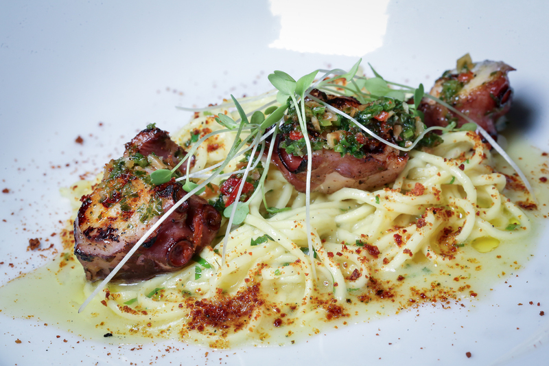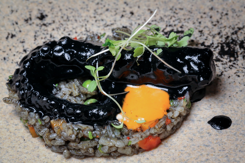 Em seguida, nos pratos principais, o chef amplia o repertório reunindo arroz negro de polvo, polvo baby com purê de batatas e manjericão, capelini com polvo e limão e polvo espanhol com bacon, espuma de queijo, alho e farofa de amendoim.
