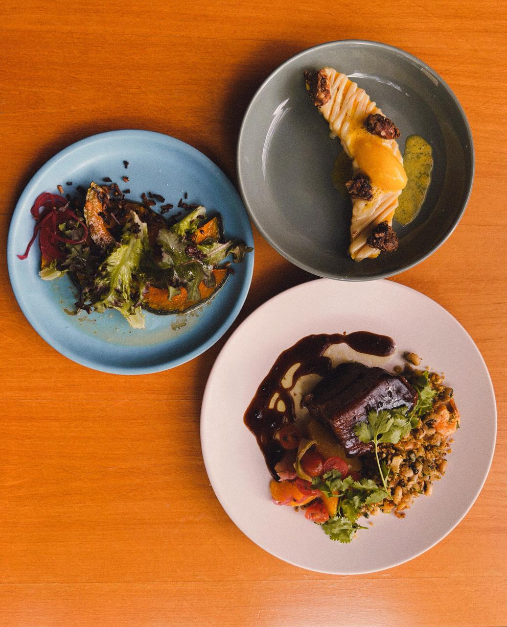 A viagem começa com abóbora assada no tucupi, acompanhada por folhas frescas, picles de cebola roxa e castanha-do-Brasil. Na taça, o Nederburg Sauvignon Blanc (Paarl | África do Sul) aparece fresco, cítrico e floral, com notas de maracujá.