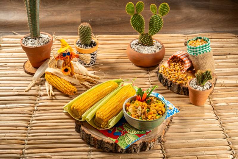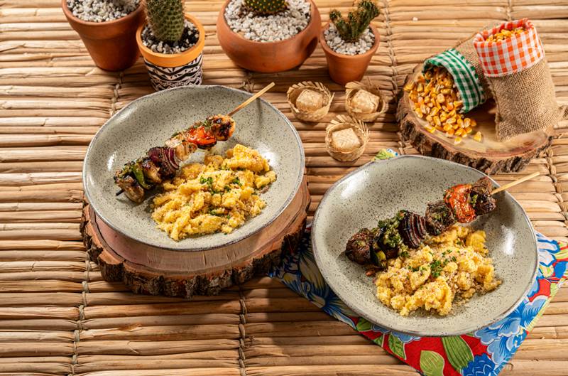 Os cafés Castália e Café e um Chêro apostam no milho como protagonista, oferecendo bolo com creme de caramelo e raspas de laranja (R$ 20), caldo com frango (R$ 20) e pamonha doce e salgada (R$ 19, cada). A barraca do Fausto & Manoel preparou a tradicional galinhada (R$ 15), enquanto o Izzi Wine Garden traz os espetinhos de carne (R$ 36) e frango (R$ 28), outro clássico das festanças.
