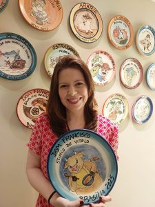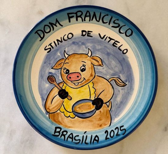 Depois de você saborear a exclusiva iguaria recebe de presente um prato de cerâmica alusivo à receita, que tem sido objeto de guarda de uma legião de colecionadores por todo o Brasil. A ideia de estampar num prato a criativa sugestão do chef de cozinha veio da Itália, o idealizador Danio Braga um dia se perguntou: “Por que não oferecer aos clientes que gostam de comer bem uma lembrança que pudessem levar para casa além da conta?”