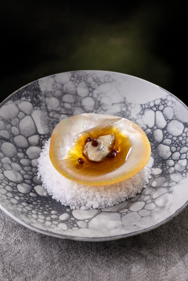 Composto por oito etapas, o menu começa com croissants em formato de esfera, biscoitos de polvilho ao curry, focaccia crisp e um blend de azeite extravirgem assinado por Claude Troisgros. Após, babaganuche de jiló e caju confit, seguido por barriga de atum, wasabi e caviar de chia, nova entradinha traz pudim de ovo, ouriço e cogumelos.