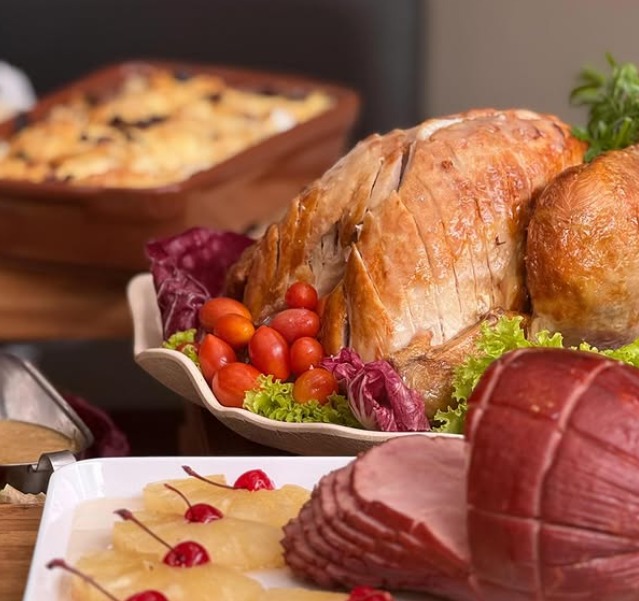 Entre os destaques estão o peru com molho de champanhe e laranja (R$ 470), roast beef de filé mignon (R$ 440/kg), porchetta crocante (R$ 240/kg), tender com mostarda e mel (R$ 350) e pernil assado (R$ 350 – 3kg). Os acompanhamentos vão do arroz à grega às versões mais elaboradas, como brandade de filhote e farofa natalina com castanhas. A confeitaria da casa também oferece panetones artesanais e sobremesas clássicas como banoffee (R$ 220 – aprox. 1,6kg), cheesecakes e pavês (R$ 240 – aprox. 1,8kg). Informações: 3532-2958 (Asa Sul) e 3562-5177 (Taguatinga).
