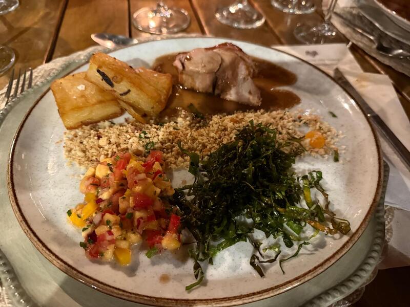 Coube a chef da casa Kelly Rodrigues a execução de saborosos pratos como o antipasto de folhas frescas, figo caramelizado, castanha de baru, tomate confit, queijo do Seu João e redução de balsâmico. Polenta brustolada com ragu de linguica Duroc, boursin artesanal e brotos de rúcula vieram na entrada, enquanto molho de vinho tinto, vinagrete do Cerrado, farofa de castanhas e crispy de couve acompanharam o assado principal.