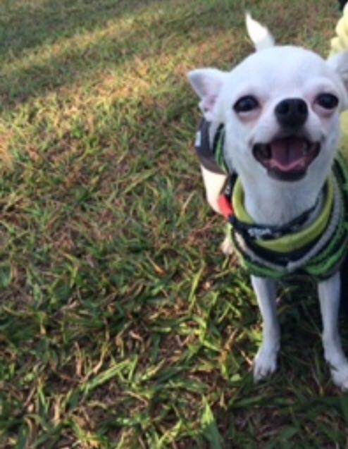 O chiuaua Bidu todo feliz, no CCBB: “O gramado é enorme, ele adora”, conta a tutora, Maria Fernanda Alonso