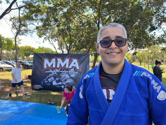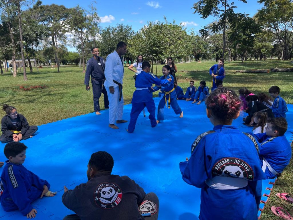 Além de projetos de voluntariado, que existem no próprio Parque da Cidade, como o Correndo com você, que já retratei aqui, um trabalho de corredores guias de pessoas com deficiência visual, o local se transforma também em palco para outros projetos sociais que se apresentam para chamar atenção dos visitantes, mostrar o trabalho realizado, além de aproveitarem o dia com os participantes. Já presenciei várias apresentações de diferentes projetos, iniciativas e grupos de pessoas com alguma finalidade social e educativa por lá. Outro dia me chamou atenção uma grande quantidade de crianças lutando Jiu Jitsu. Achei que se trava de algum campeonato e me aproximei para assistir um pouco. Foi quando conheci um dos responsáveis pelo evento, Eduardo Santos, que, com muita gentiliza, conversou comigo.