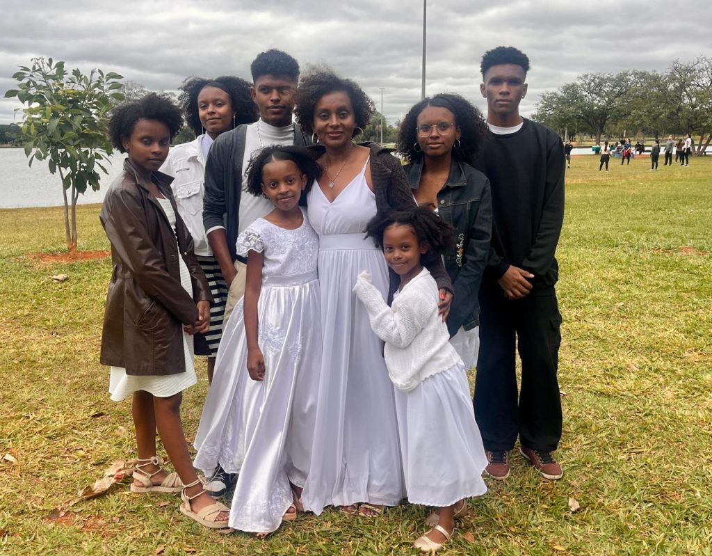 Maíla Ferreira de Oliveira é de São Francisco, Minas Gerais, e mora há um ano e sete meses em Brasília, no Areal. Estudante de biblioteconomia, faz estágio na Procuradoria Geral do Distrito Federal – PGDF, é divorciada, 41 anos e tem 7 filhos. Fazia frio naquela manhã, mas lá estavam Maíla e seus 7 filhos juntinhos, pousando para o fotógrafo. Achei que era alguma campanha publicitária ou de moda para pessoas negras e quando ela me falou que se tratava de fotos para um livro sobre mães reais, quis conhecê-la melhor, sem disfarçar minha curiosidade sobre os desafios de ter tantos filhos. Ela respondeu às perguntas com a calma e a paciência que diz ser preciso para dar conta de uma família tão grande, principalmente sozinha.