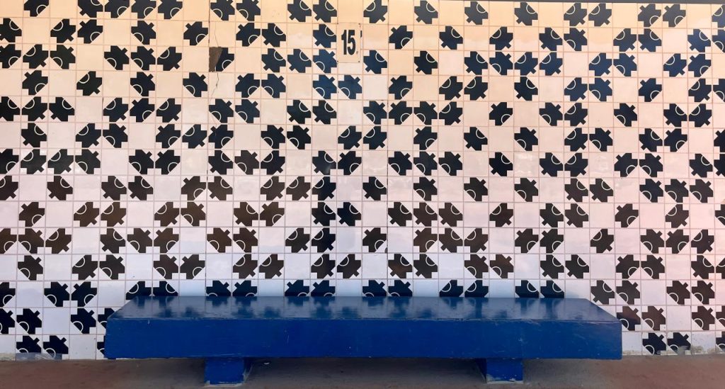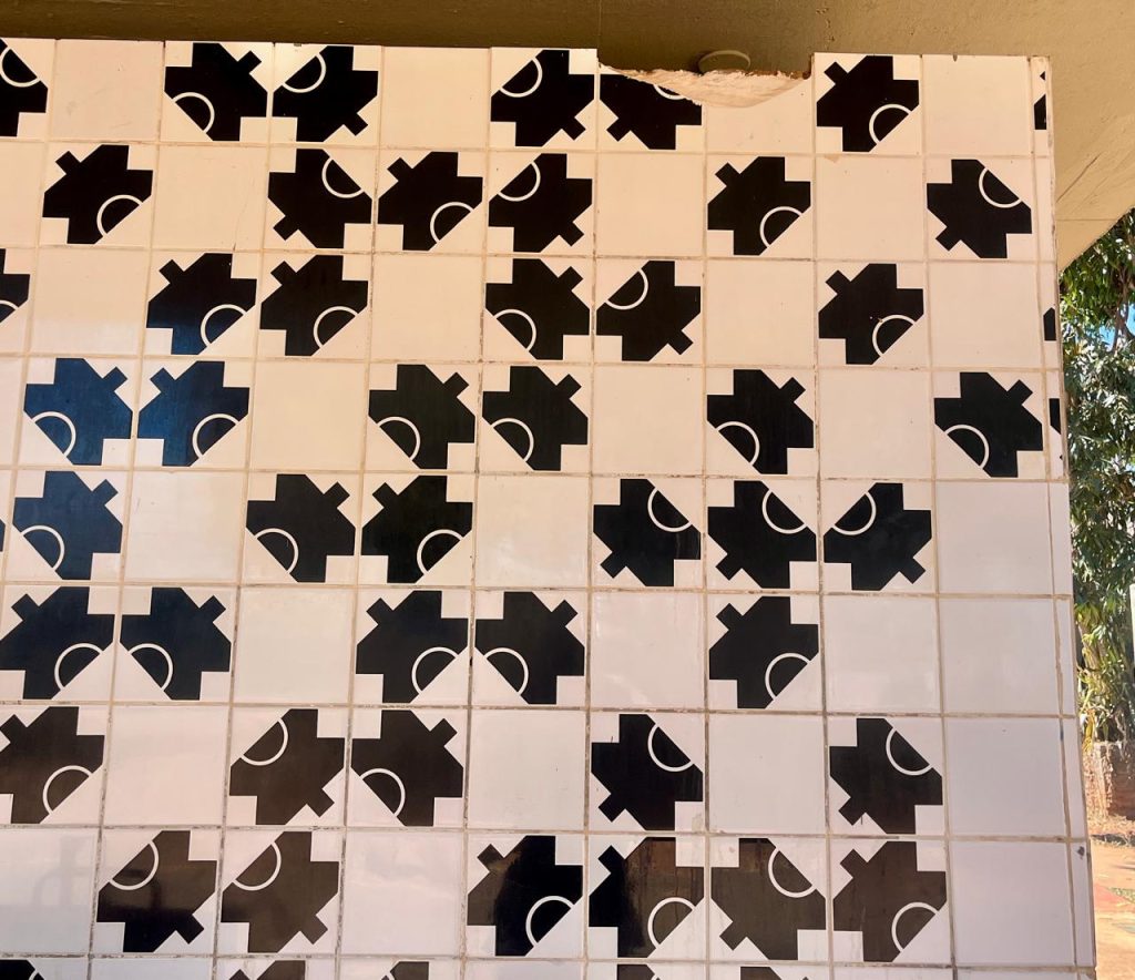 Os desenhos geométricos dos azulejos, feitos com retas, triângulos e círculos, formam figuras – que, para uns parecem borboletas e para outros são desenhos de árvores – dispostas na forma usual do artista, como um jogo de quebra cabeças.
