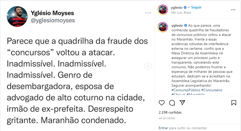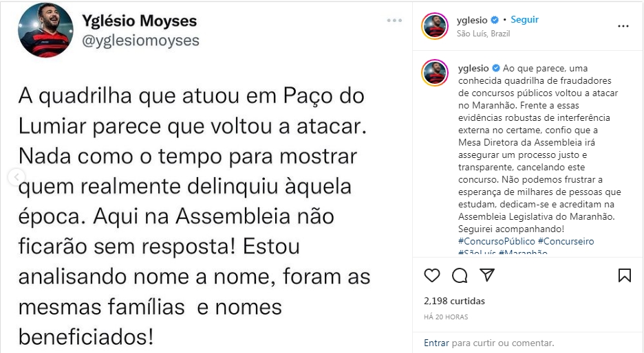 O deputado estadual do Maranhão Yglésio Moyses, em suas redes sociais, denunciiu suposta fraude no concurso da Assembleia Legislativa do estado (Alema). Em sua publicação, o deputado afirma que “parece que a quadrilha da fraude dos ‘concursos’ voltou a atacar. Inadmissível. Inadmissível. Inadmissível. Genro da desembargadora, esposa de advogado de alto coturno na cidade, irmão de ex-prefeita. Desrespeito gritante. Maranhão condenado”.