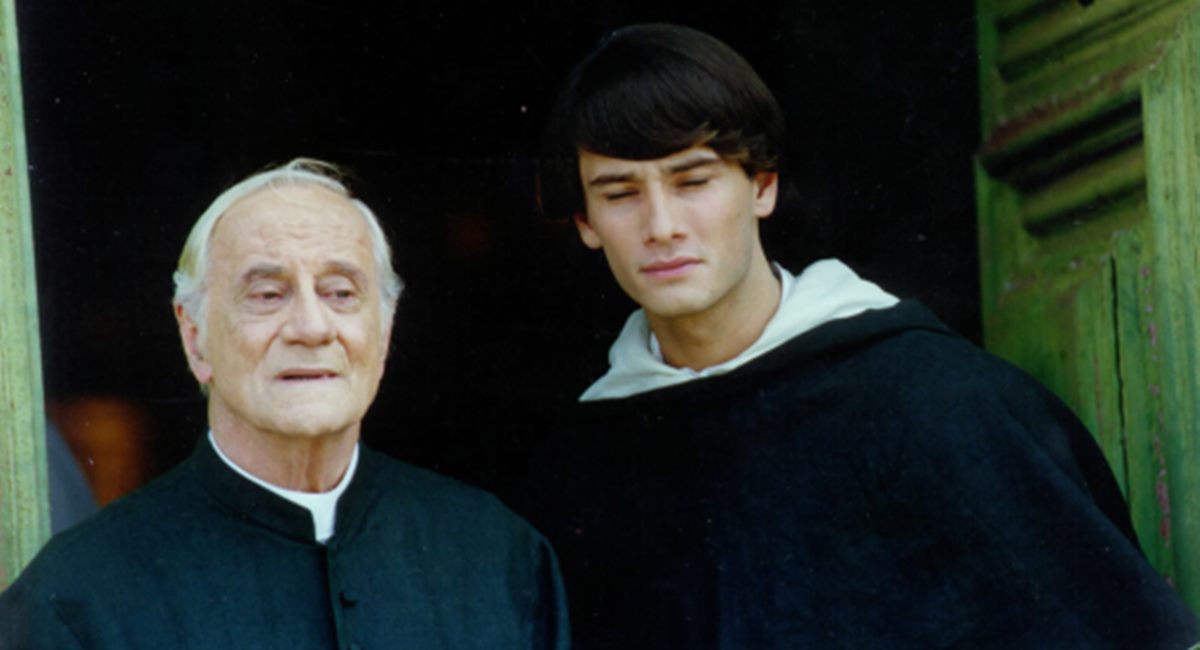 Paulo Autran como padre Nelson e Rodrigo Santoro como frei Malthus na minissérie Hilda Furacão