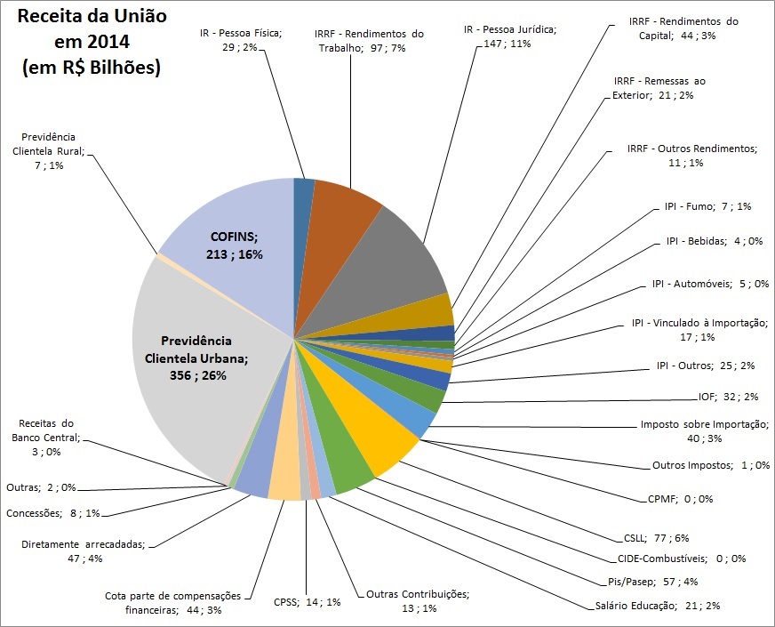 A Previdência contribuiu com 43% da Receita da União em 2014 (consumiu 28%).