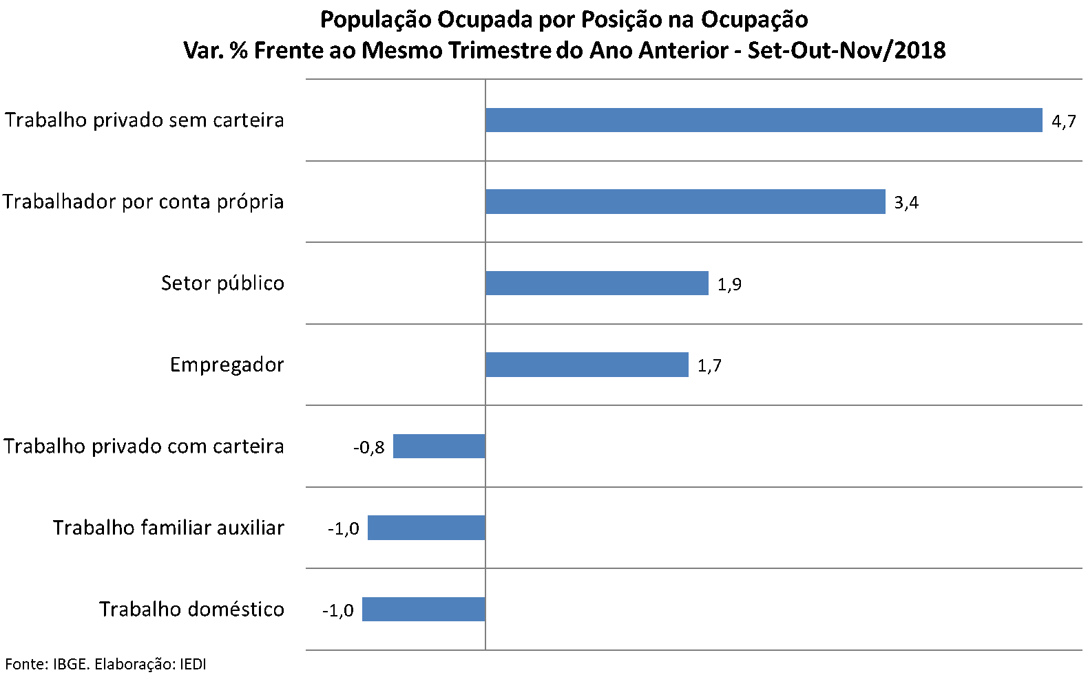 O segundo aspecto a ser destacado é a qualidade das ocupações que vêm sendo criadas. Tratam-se basicamente de trabalho sem carteira e trabalho por conta própria, como mostram as variações interanuais a seguir.